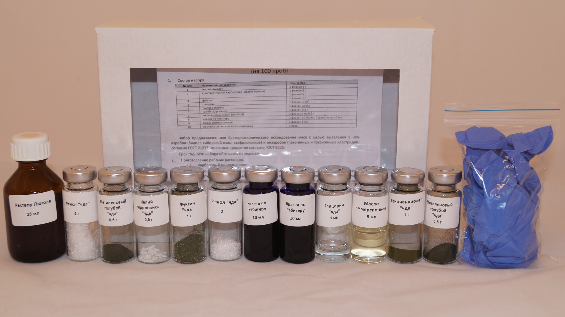 Набор химреактивов для микроскопии мазков предназначен для бактериоскопического исследования мяса с целью выявления в нем аэробов (бацилл сибирской язвы, стафилококков) и анаэробов (патогенных и токсигенных клостридий), молочных продуктов