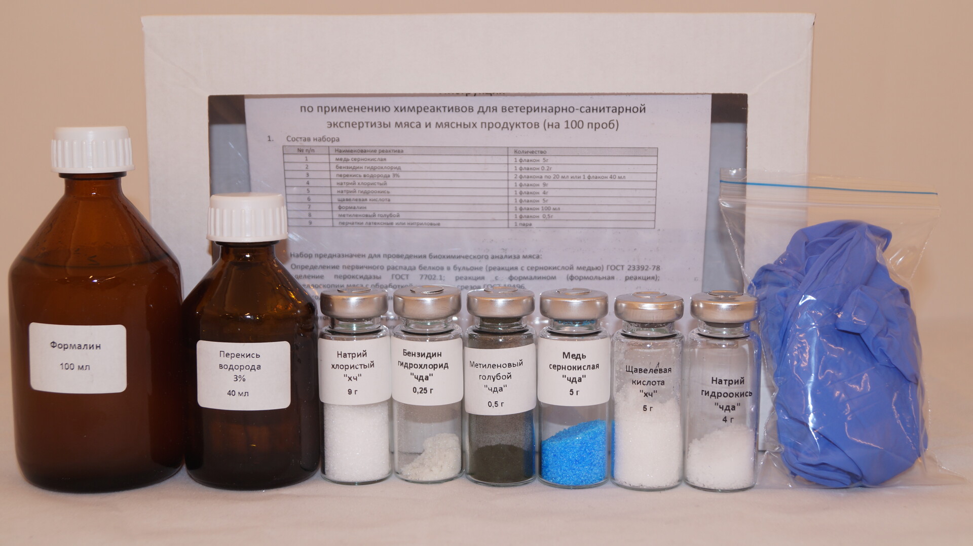 Набор химреактивов для ветсанэкспертизы мяса предназначен для проведения биохимического анализа: Определение первичного распада белков в бульоне (реакция с сернокислой медью); определение пероксидазы; формольная реакция; трихинеллоскопии мяса с обработкой мышечных срезов