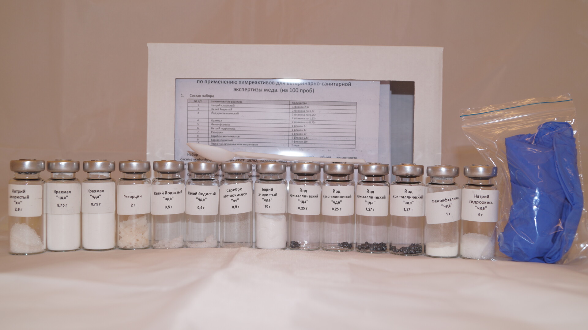 Набор химреактивов для ветсанэкспертизы меда предназначен для определения диастазной активности, общей кислотности, оксиметилфурфурола, падевого меда и фальсификации меда свекловичной (сахарной) патокой, крахмалом и мукой