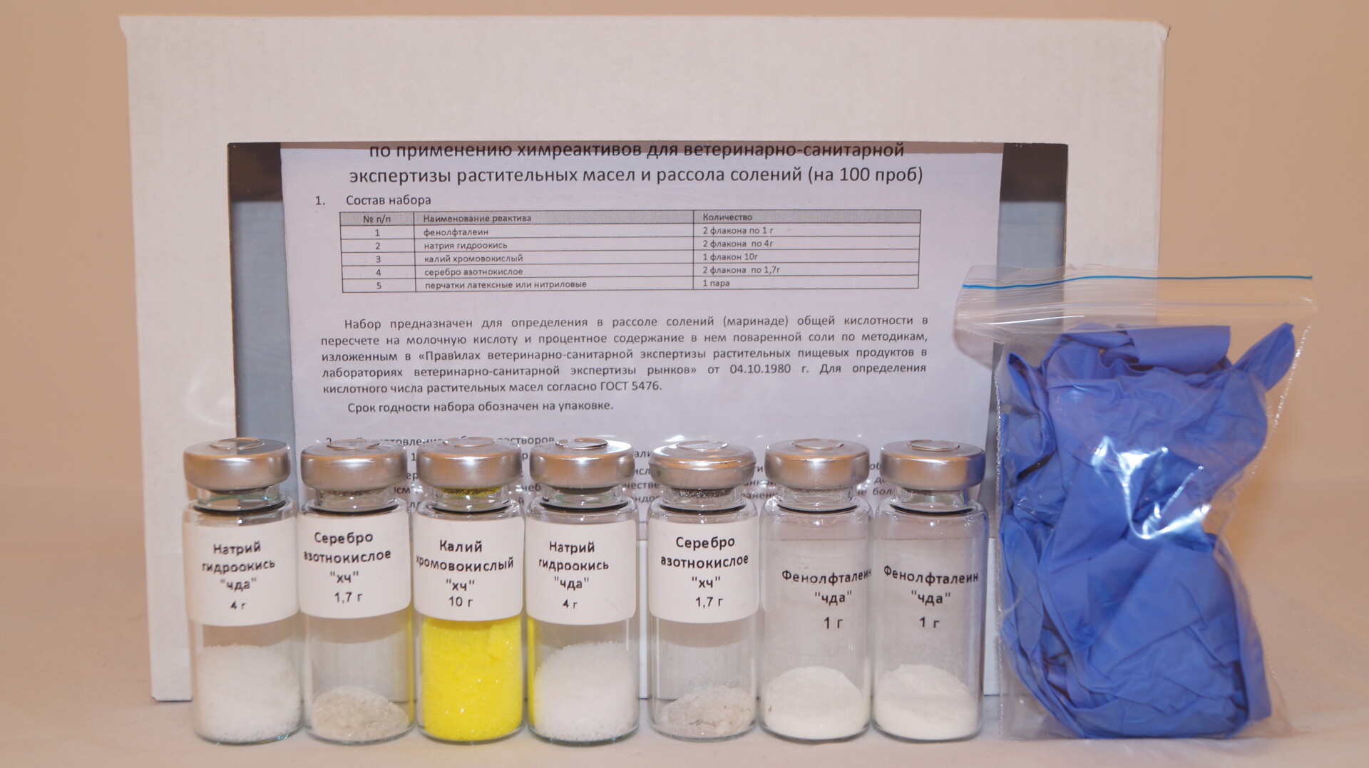 Набор химреактивов для ветсанэкспертизы растительных масел и рассола солений предназначен для определения в рассоле солений (маринаде) общей кислотности в пересчете на молочную кислоту и процентное содержание в нем поваренной соли, для определения кислотного числа растительных масел