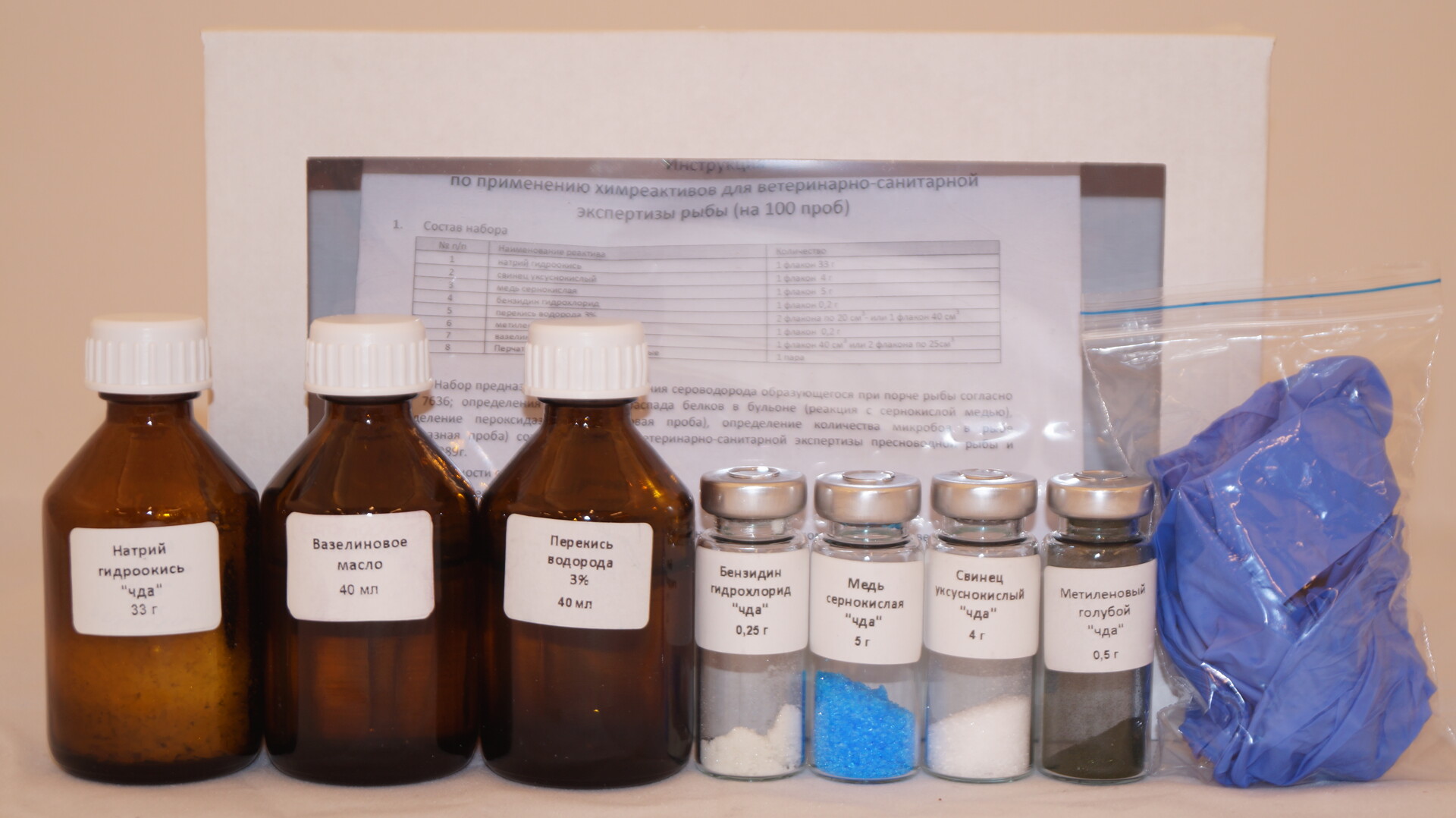 Набор химреактивов для ветсанэкспертизы рыбы предназначен для определения сероводорода образующегося при порче рыбы; определения первичного распада белков в бульоне (реакция с сернокислой медью), определение пероксидазы (бензидиновая проба), определение количества микробов в рыбе (редуктазная проба)